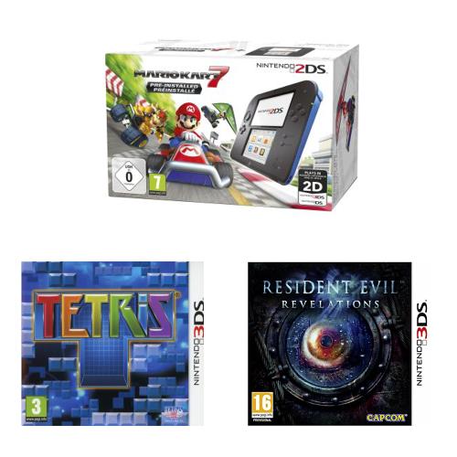 Deuxième offre, qui concerne la Nintendo 2DS. Là encore, vous allez pouvoir profiter de deux jeux offerts. mais ce sont, au total, trois jeux qui sont inclus dans ce pack Fnac. Ainsi, le pack Nintendo 2DS Mario Kart 7 (jeu pré-installé dans la console) vous est vendu au prix de 99 euros (le prix de la console seule, avec MK7) avec deux titres offerts, l’excellent Resident Evil Revelations ainsi que l’indispensable Tetris.