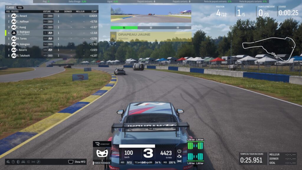 Par contre, là où le bât blesse, c’est quand on se penche sur le comportement des concurrents en mode solo. Il n’est pas rare de voir des voitures s’envoler, de voir des carambolages au premier virage ou une colonie de tondeuse partir de la piste avant de revenir violemment sur vous. Et bien entendu la pénalité sera pour vous ! Au bout de 20 points de pénalité (accident, limites de piste et de vitesse dépassées, drapeaux non respectés…) ce sera l’exclusion ! Bref, l’IA n’est pas digne d’une simulation et même d’un jeu vidéo de course de 2025. C’est vraiment l’un des gros points noirs du jeu.
