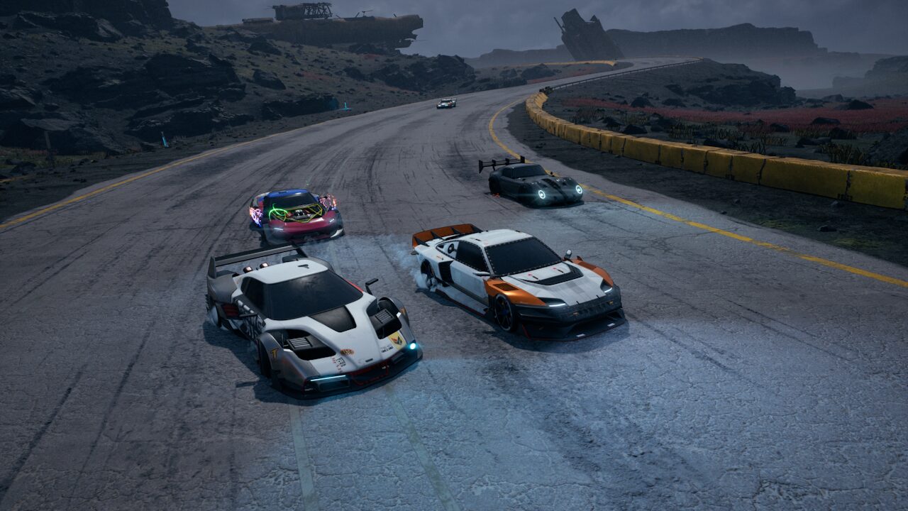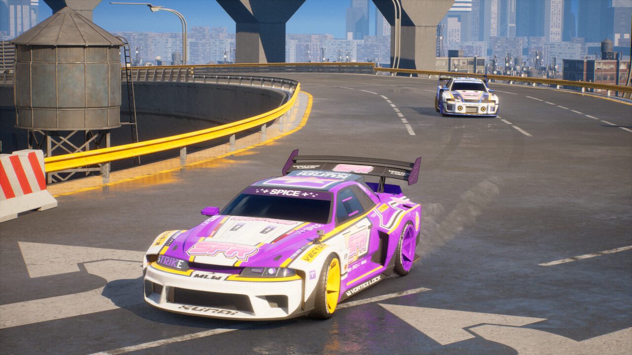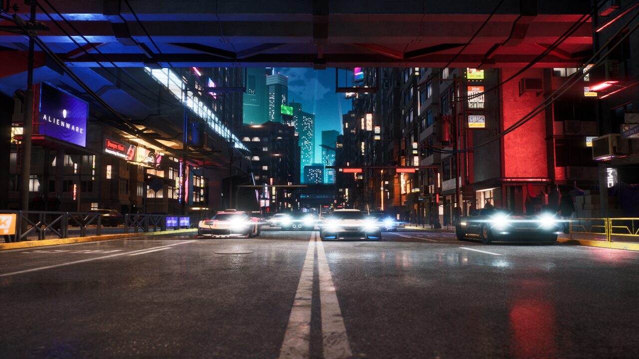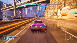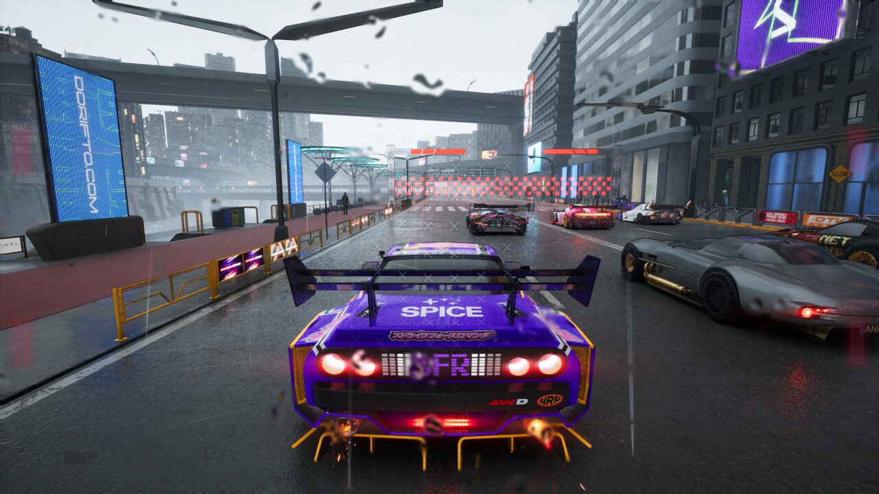 Depuis 4-5 ans, la mode du néon et du futuriste est on ne peut plus omniprésente dans le jeu vidéo. C’est l’un des symptômes du manque de diversité actuel du secteur. Pourtant, dans le petit monde des jeux vidéo de course, c’est presque une nouveauté. Screamer surfe donc sur la mode avec son style “Cyberpunk” pour sa ville de Néo Rey. Malheureusement, c’est tellement vu ailleurs que cela inhibe le côté “nouveau” pour ce genre de jeux. En tout cas, les développeurs italiens prouvent une fois de plus la volonté d’avoir une direction artistique forte et différente des autres. Ils assument et on ne peut que les féliciter pour. Graphiquement, l’ensemble du jeu est d’assez bonne facture. Les voitures sont plutôt bien modélisées et possèdent des détails sympathiques (comme une Go Pro) qui collent à la personnalité des pilotes. C’est très appréciable. Néanmoins, les décors manquent de détails et de vie. L’ensemble fait parfois assez vide, surtout dans certaines zones. On est très loin d’un Trail Out (FlatOut-like indépendant qui vient de sortir sur PlayStation 5) par exemple. Bref, c’est joli mais cela manque de plus pour vraiment éblouir le joueur.